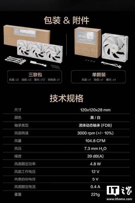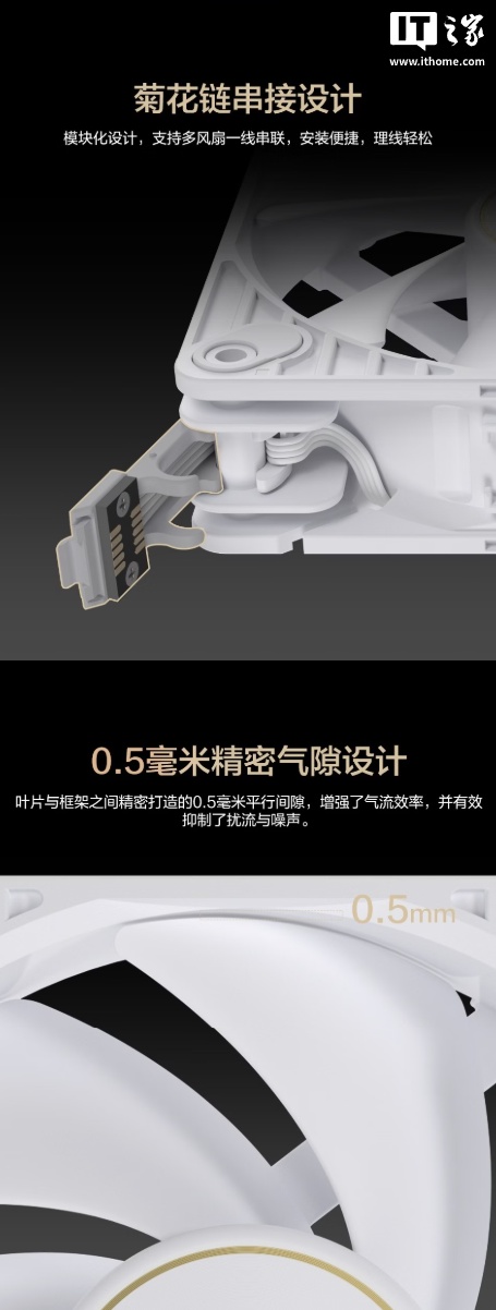 规格方面,这款风扇内置三相六极风扇电机,采用低频率运行模式,可抑制噪音与震动,支持菊花链串联,可让多风扇一线串联,让理线更加轻松,叶片与框架之间留有 0.5mm 平行间隙,增强气流效率,支持在 0-3000RPM 之间调速。