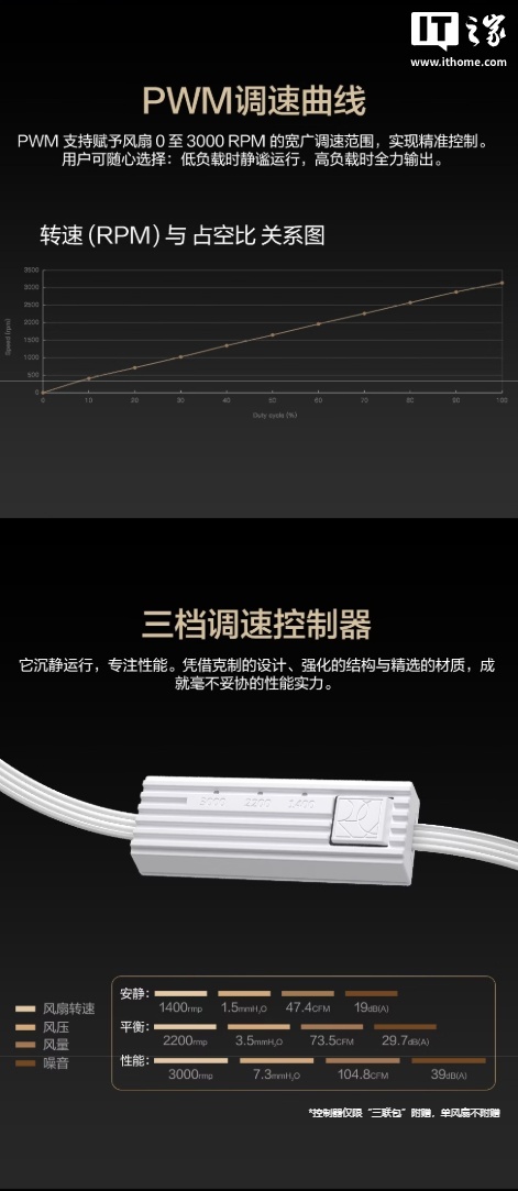 此外,这款风扇的三联包版本还附赠有调速控制器,可在 3000、2200、1400RPM 之间调整。