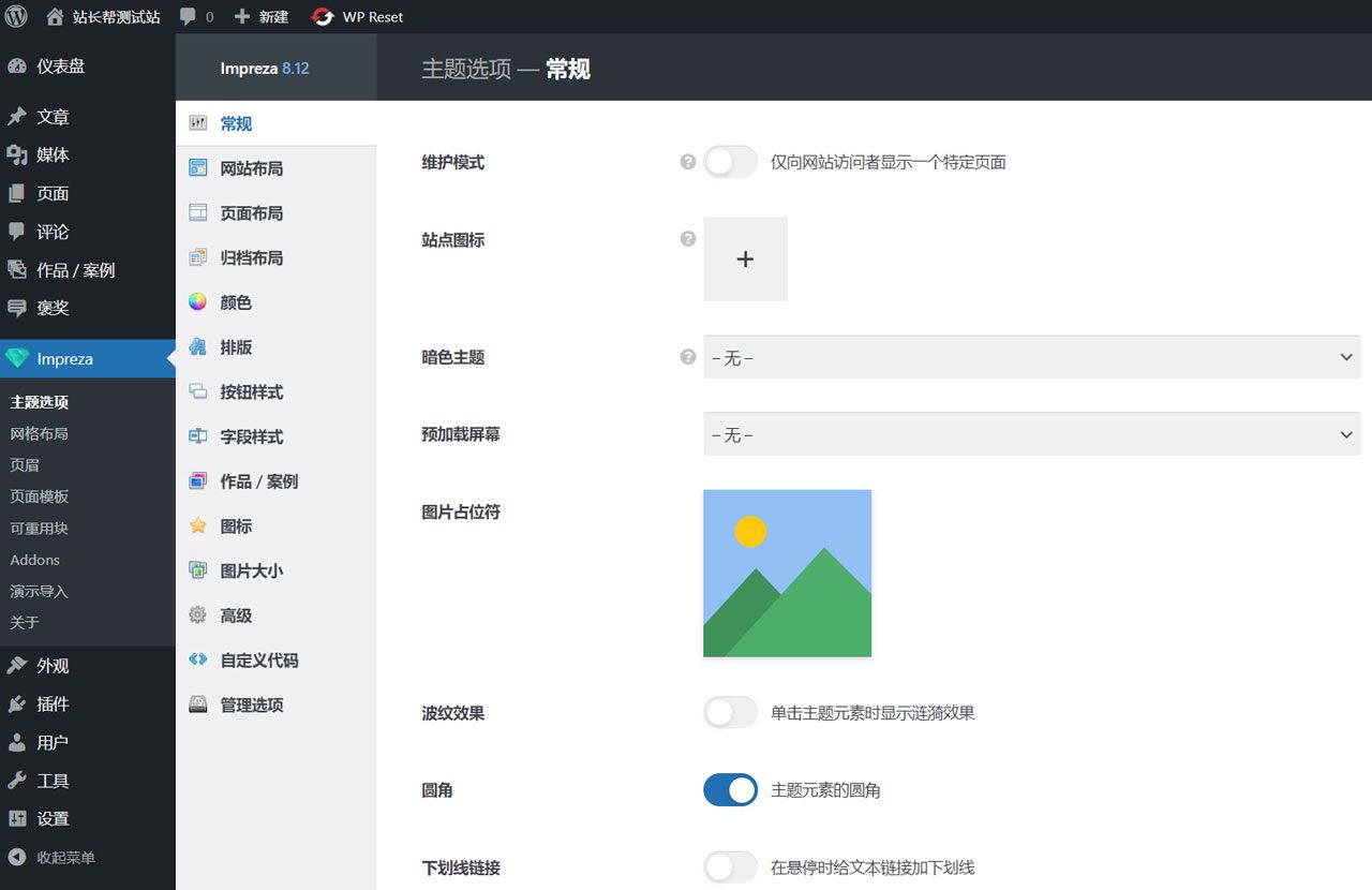 此处有个小问题需注意:在主题选项中切换左侧的菜单,有可能不会自动跳转页面。需要点击链接后再按F5刷新一下浏览器才能跳转。这是因为后台的部分境外JS库加载失效问题,不影响设置和使用。