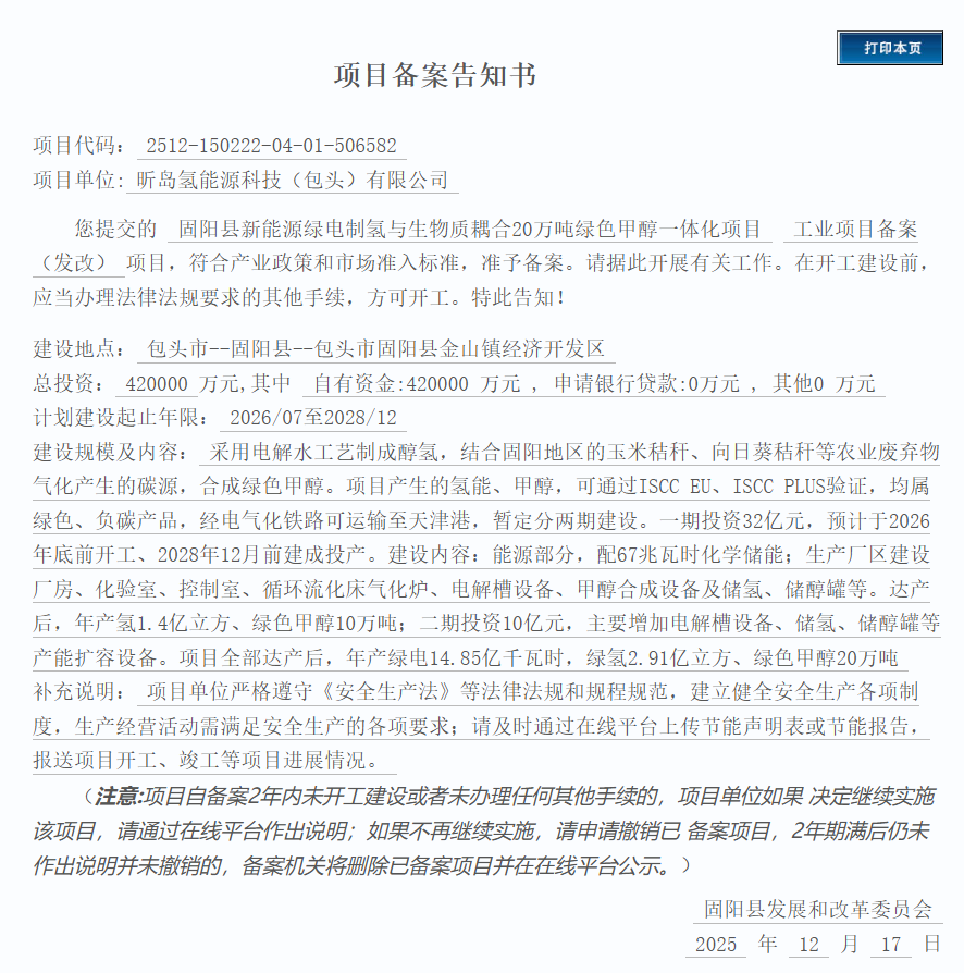 12月18日,内蒙古自治区包头市固阳县新能源绿电制氢与生物质耦合20万吨绿色甲醇一体化项目获备案。