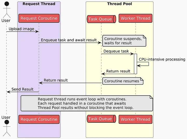 Python 走了类似路线。asyncio 出来后,I/O-bound 代码有了好工具,但 GIL(全局解释器锁)挡着,单进程内没法真正 CPU 并行(写这篇文章时问题已解决)。阻塞操作有 loop.run_in_executor() 和 asyncio.to_thread()(Python 3.9+),把重活卸载到线程池或进程池。Event Loop 保持响应,计算并行跑。