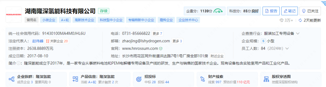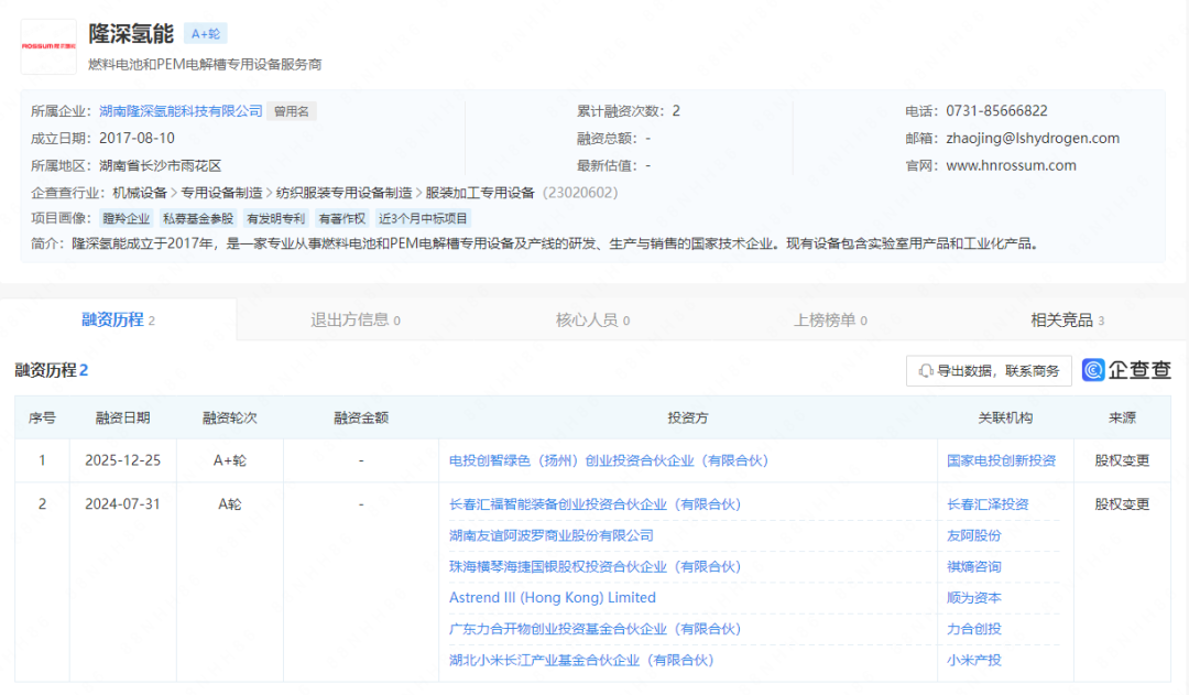 据企查查显示,12月25日,湖南隆深氢能科技有限公司(以下简称“隆深氢能”)完成A+轮融资,投资方为国家电投创新投资,完成本次融资后,隆深氢能发生股权变更,国家电投创新投资持有隆深氢能5.2632%的股份。