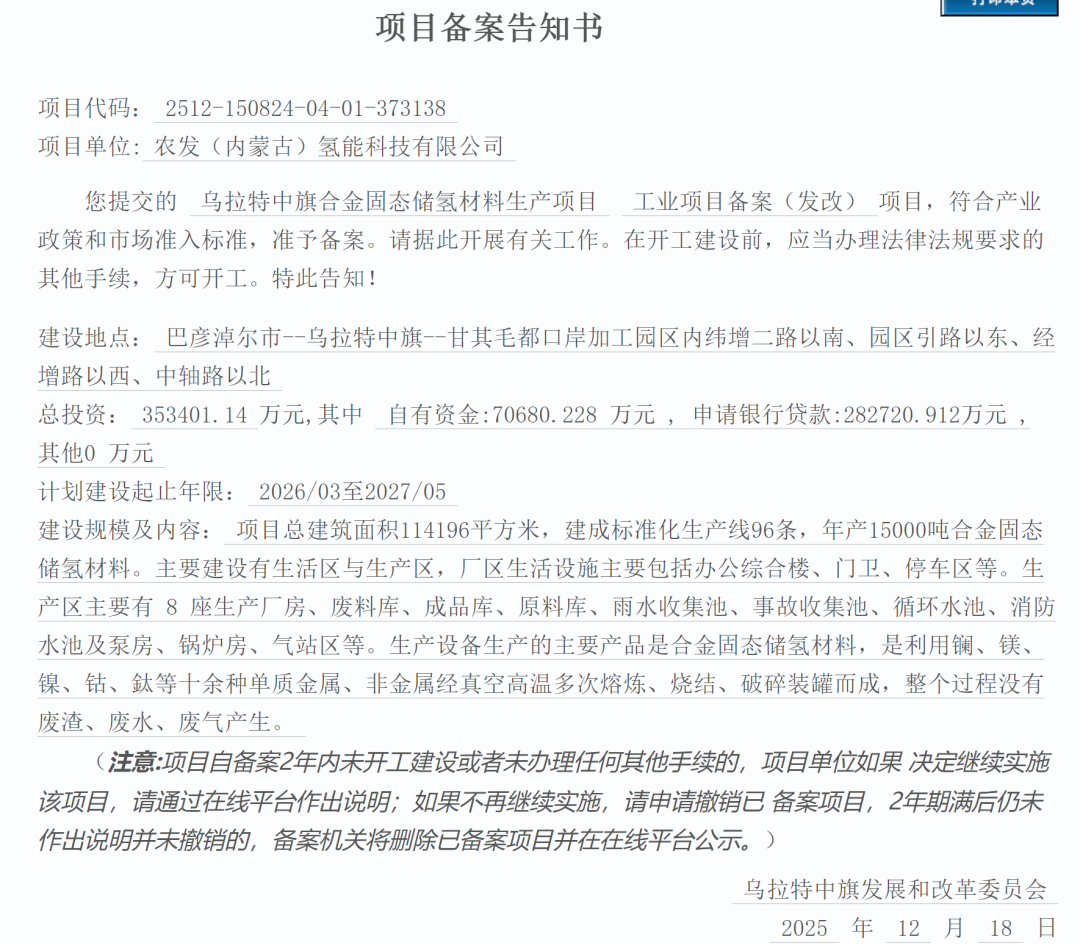 农发(内蒙古)氢能科技有限公司提交的乌拉特中旗合金固态储氢材料生产项目 工业项目备案(发改)项目,符合产业政策和市场准入标准,准予备案。