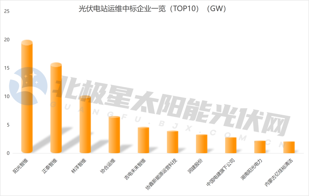 阳光智维以超20GW的成绩遥遥领先;正泰智维、林洋智维位列二、三,分别拿下16GW、10.2GW的订单;协合运维在光伏运维市场拿下超6.4GW订单。