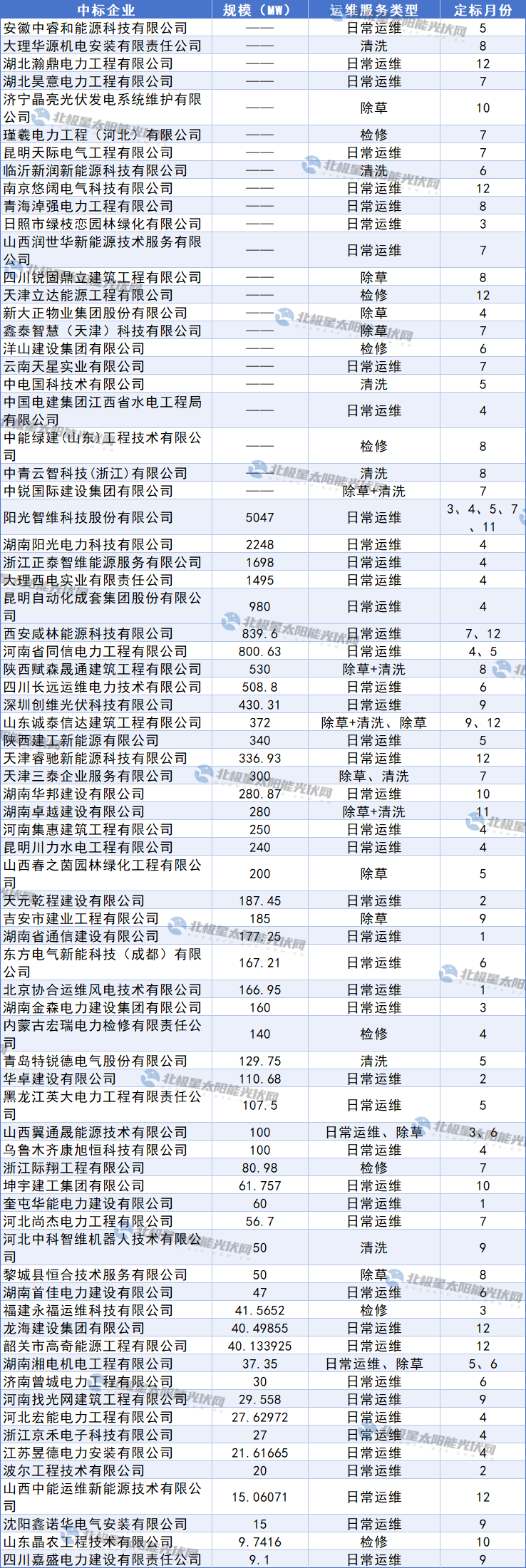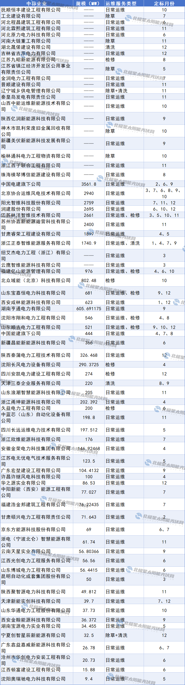 据统计,共计74家企业中标,其中,中国电建旗下公司、北京协合运维风电技术有限公司、阳光智维科技股份有限公司、润建股份有限公司、江苏林洋智维技术有限公司、甘肃睿荣工程建设有限公司、浙江正泰智维能源服务有限公司等8家企业订单规模在1.7-3.5GW之间。