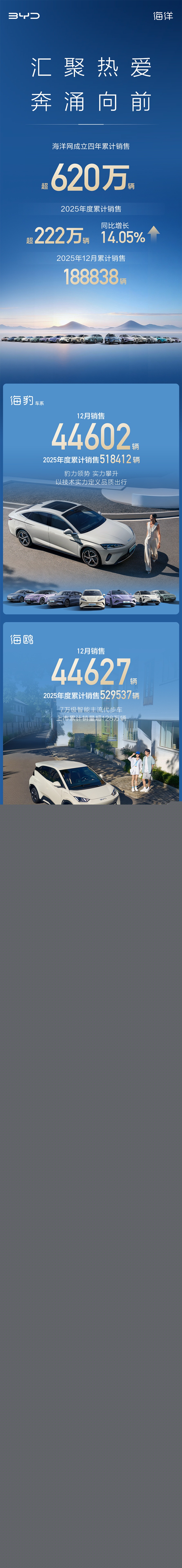 比亚迪汽车官方在 1 月 4 日宣布,比亚迪海洋网成立四年累销超 620 万辆;2025 年度累销超 222 万辆,同比增长 14.05% ;12 月销售 188838 辆。其中,宋 PLUS 车系(含 DM、EV)12 月销售 21223 辆,2025 年度累计销售 400920 辆。