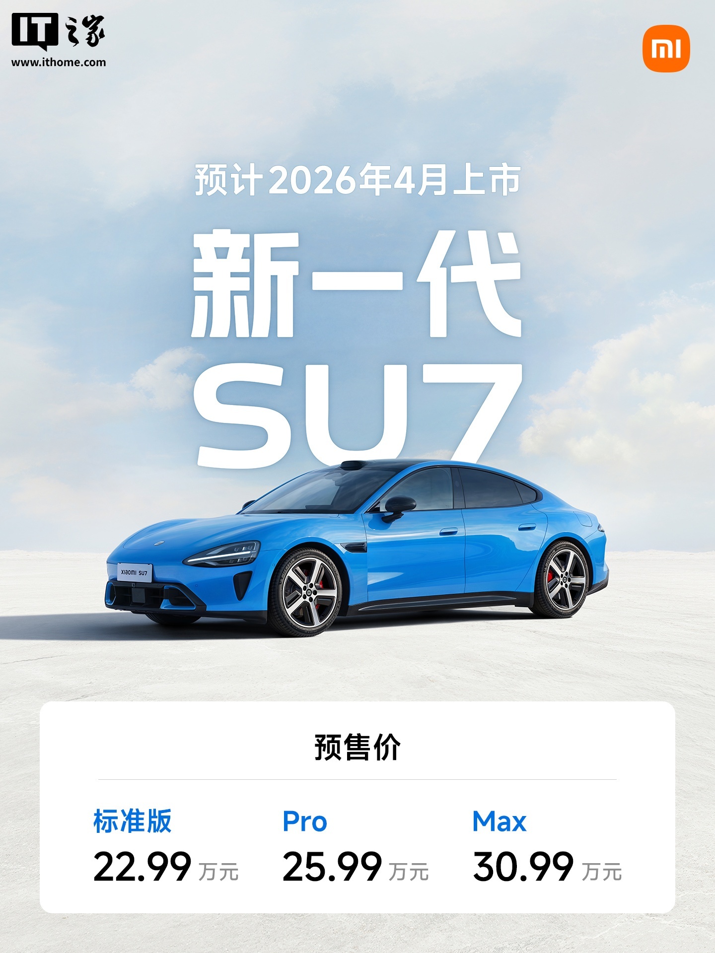 1 月 7 日消息,新一代小米 SU7 今天上午 10 时开启小订,预售价 22.99 万-30.99 万元,预计 2026 年 4 月上市。