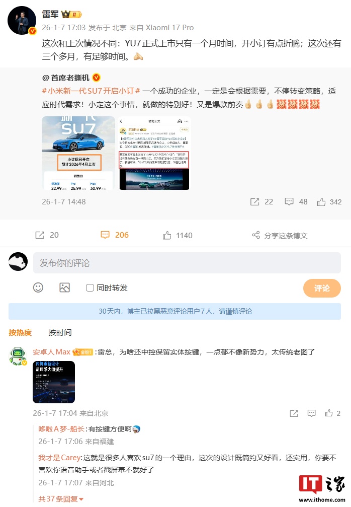 注意到,博主 @首席老撕机 对新车开启小订一事作出评价,称:“小订这个事情,就做的特别好!又是爆款前奏。”对此,小米创办人、董事长兼 CEO 雷军回应道:“这次和上次情况不同:YU7 正式上市只有一个月时间,开小订有点折腾;这次还有三个多月,有足够时间。”