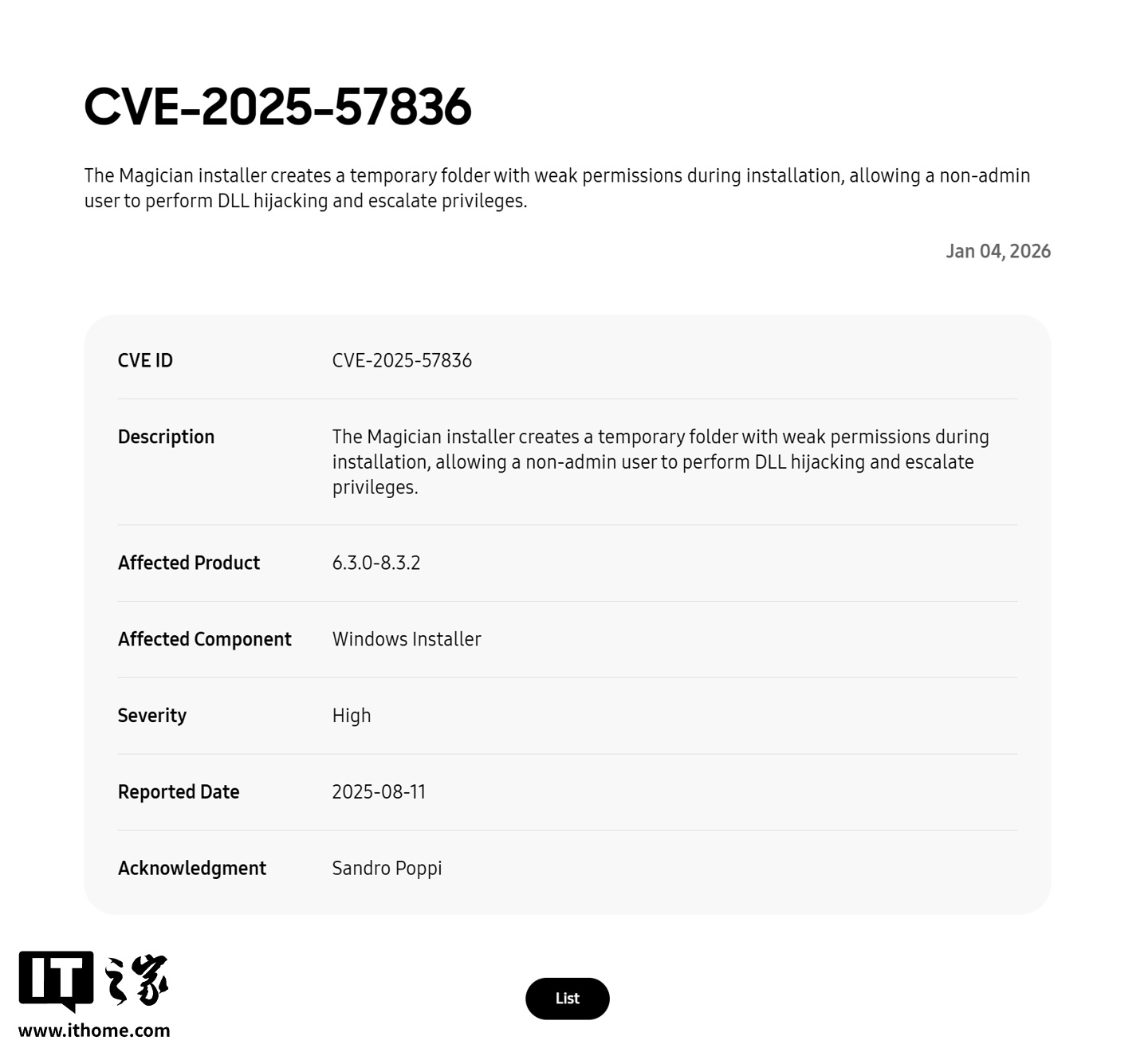 查询三星官网后发现,这些版本的三星魔术师存在 CVE-2025-57836 漏洞,可被黑客利用于提权、DLL 劫持,进而获得管理员权限,然后往应用程序目录中放置恶意代码,进而完全操控用户的电脑。