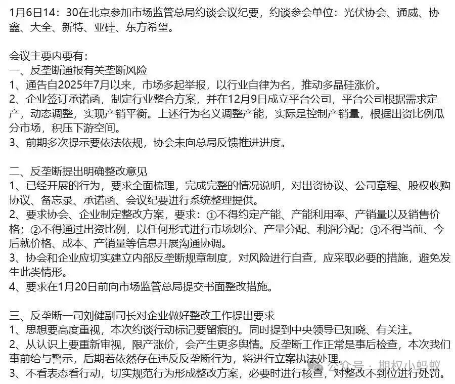 市场异动背后,一则关键消息引发关注。一份叫停多晶硅行业自律的会议纪要在光伏圈内疯传,市场传闻称,市场监管总局日前约谈了中国光伏行业协会和多家光伏企业,约谈内容涉及通报有关垄断风险,提出明确整改意见并对企业做好整改工作提出要求等。