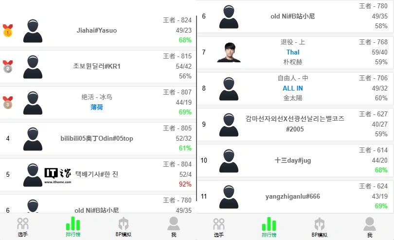 OB 数据显示,这一神秘账号从 1 月 8 号晚 23:07 开始,只用了 51 个小时、56 局游戏(52 胜 4 败,胜率 92%),就从钻石以下段位打上《英雄联盟》韩服前列,甚至在今日凌晨短暂登顶(胜率 95%),但截至发稿已落至第五。