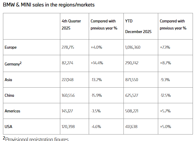 宝马集团表示,2025 年的销售表现表明,其技术中立的发展路径以及覆盖多个细分市场的高端多品牌产品战略,获得了客户的积极反馈,中国市场需求走弱则被其他地区的增长所抵消。