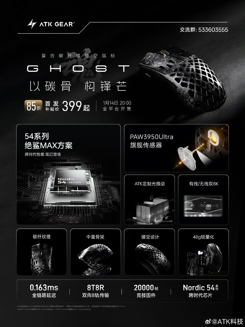 这款鼠标采用复合碳纤维镂空外壳、ATK 54 系列绝鲨 MAX 鼠标方案、Nordic 54 系列主控、PAW3950 Ultra 传感器,ATK 定制光微动;兼容中小手握持,重量仅有 48g。