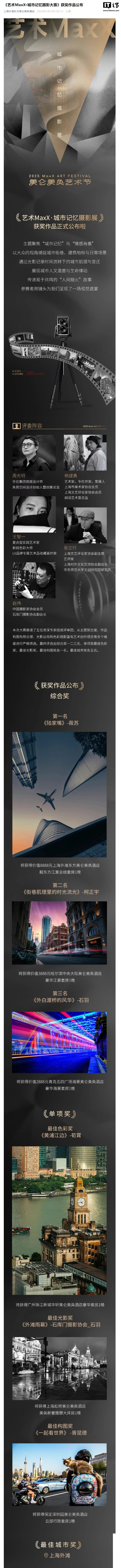 查询获悉,该摄影大赛还请了 5 位专业评委给作品打分,评委中还不乏华住集团首席设计师、协会副会长等大咖。这项名为“艺术 MaxX・城市记忆摄影大赛”比赛,在华住会旗下上海东方美仑美奂酒店和华住美好家族官方公众号均有宣传。