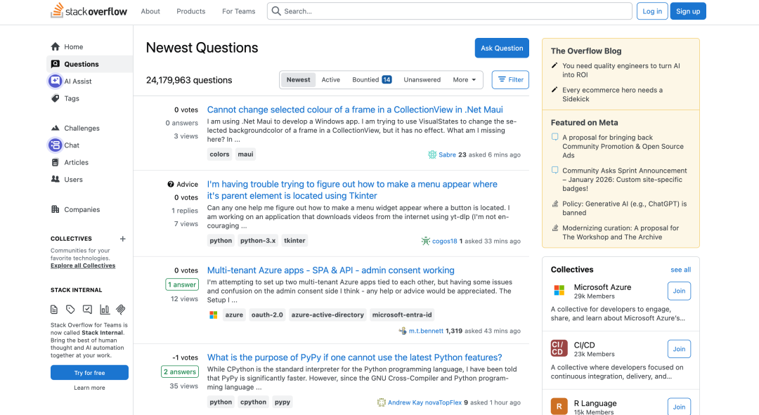 Stack Overflow 缺乏吸引新用户加入的渠道,老用户逐渐转向大模型交互,平台上有关新技术的讨论也日渐稀少。