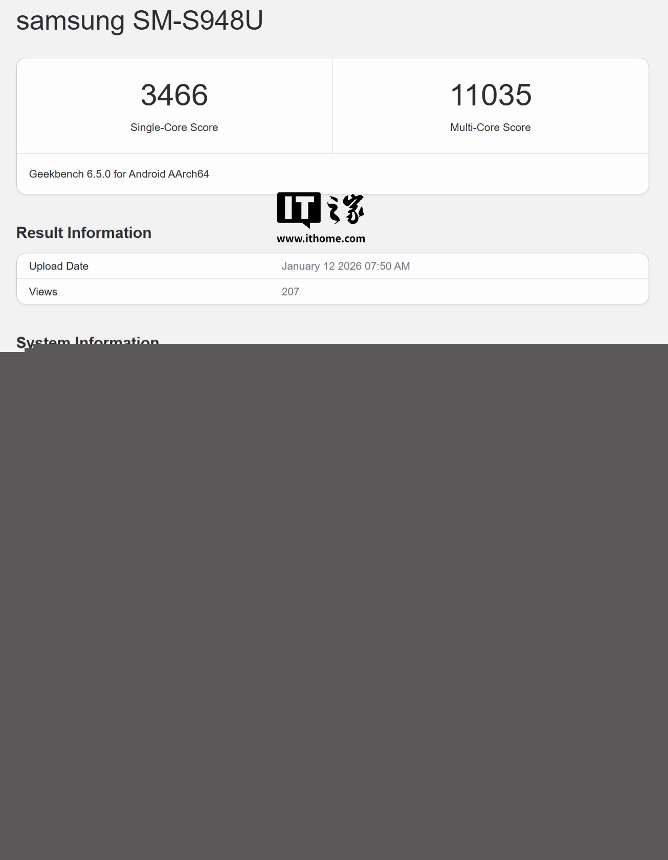 1 月 13 日消息,科技媒体 Wccftech 昨日(1 月 12 日)发布博文,报道称型号为 SM-S948U 的三星手机现身 GeekBench 跑分库,6.5.0 版本单核成绩 3466 分,多核成绩为 11035 分,基于此前 GSMA IMEI 数据库信息,该机型号上市后名为 Galaxy S26 Ultra。
