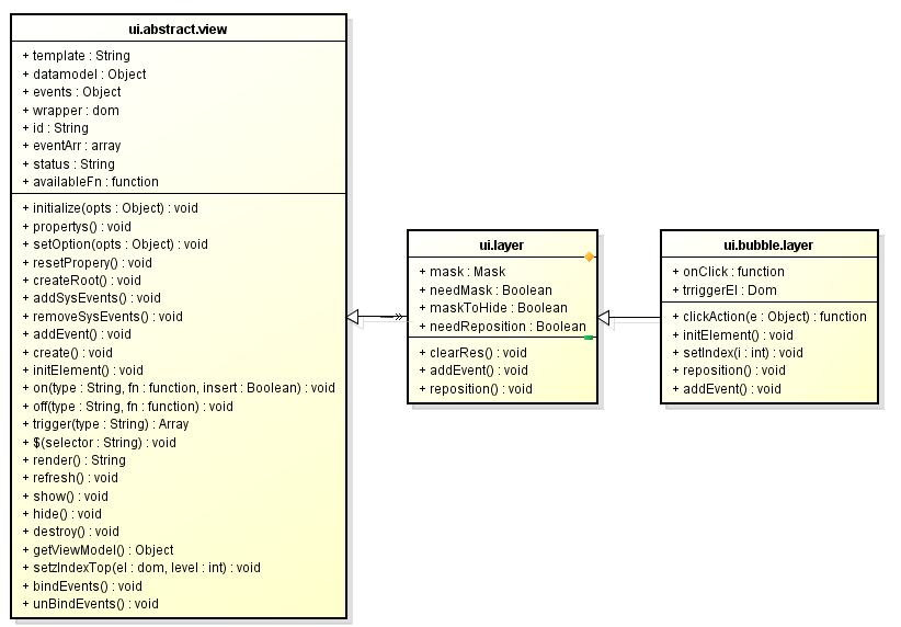 复制代码代码如下:define(['UILayer', getAppUITemplatePath('ui.bubble.layer')], function (UILayer, template) { return _.inherit(UILayer, { propertys: function ($super) { $super(); //html模板 this.template = template; this.needMask = false;</p><p> this.datamodel = { data: [], wrapperClass: 'cui-bubble-layer', upClass: 'cui-pop--triangle-up', downClass: 'cui-pop--triangle-down', curClass: 'active', itemStyleClass: '', needBorder: true, index: -1, dir: 'up' //箭头方向默认值 };</p><p> this.events = { 'click .cui-pop-list>li': 'clickAction' };</p><p> this.onClick = function (data, index, el, e) { console.log(arguments);// this.setIndex(index); };</p><p> this.width = null;</p><p> //三角图标偏移量 this.triangleLeft = null; this.triangleRight = null;</p><p> this.triggerEl = null;</p><p> },</p><p> initialize: function ($super, opts) { $super(opts); },</p><p> createRoot: function (html) { this.$el = $(html).hide().attr('id', this.id); },</p><p> clickAction: function (e) { var el = $(e.currentTarget); var i = el.attr('data-index'); var data = this.datamodel.data[i]; this.onClick.call(this, data, i, el, e); },</p><p> initElement: function () { this.el = this.$el; this.triangleEl = this.$('.cui-pop-triangle'); this.windowWidth = $(window).width(); },</p><p> setIndex: function (i) { var curClass = this.datamodel.curClass; i = parseInt(i); if (i < 0 || i > this.datamodel.data.length || i == this.datamodel.index) return; this.datamodel.index = i;</p><p> //这里不以datamodel改变引起整个dom变化了,不划算 this.$('.cui-pop-list li').removeClass(curClass); this.$('li[data-index="' + i + '"]').addClass(curClass); },</p><p> //位置定位 reposition: function () { if (!this.triggerEl) return; var offset = this.triggerEl.offset(); var step = 6, w = offset.width - step; var top = 0, left = 0, right; if (this.datamodel.dir == 'up') { top = (offset.top + offset.height + 8) + 'px'; } else { top = (offset.top - this.el.offset().height - 8) + 'px'; }</p><p> left = (offset.left + 2) + 'px';</p><p> if (offset.left + (parseInt(this.width) || w) > this.windowWidth) { this.el.css({ width: this.width || w, top: top, right: '2px' }); } else { this.el.css({ width: this.width || w, top: top, left: left }); }</p><p> if (this.triangleLeft) { this.triangleEl.css({ 'left': this.triangleLeft, 'right': 'auto' }); } if (this.triangleRight) { this.triangleEl.css({ 'right': this.triangleRight, 'left': 'auto' }); } },</p><p> addEvent: function ($super) { $super(); this.on('onCreate', function () { this.$el.removeClass('cui-layer'); this.$el.css({ position: 'absolute' }); }); this.on('onShow', function () { this.setzIndexTop(this.el); }); }</p><p> });</p><p>});这里开始调用的,便可做简单实现: