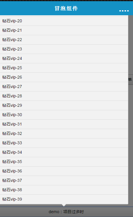 复制代码代码如下:'click .demo1': function (e) { if (!this.demo1) { var data = [{ name: '<span class="center">普通会员</span>' }, { name: '<span class="center">vip</span>' }, { name: '<span class="center">高级vip</span>' }, { name: '<span class="center">钻石vip</span>'}]; this.list = new UIBubbleLayer({ datamodel: { data: data }, triggerEl: $(e.currentTarget), width: '150px', triangleLeft: '20px' }); } this.list.show();}稍作修改便可形成另一种样子: