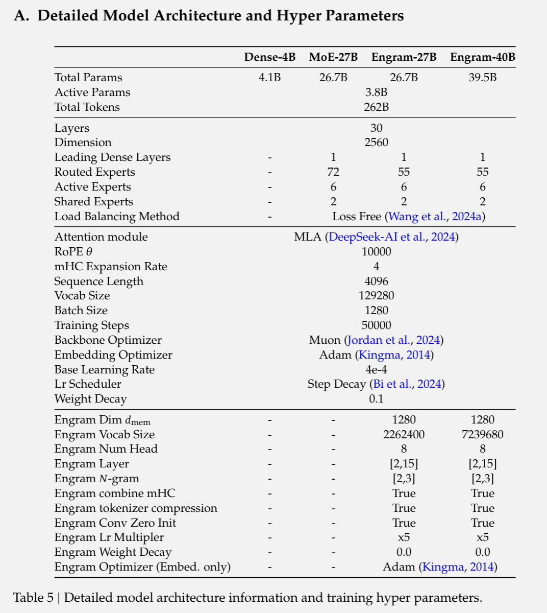 Engram-40B:进一步扩展 Engram 模块,保持专家数量不变,Engram 记忆参数增至 18.5B,总参数 39.5B。