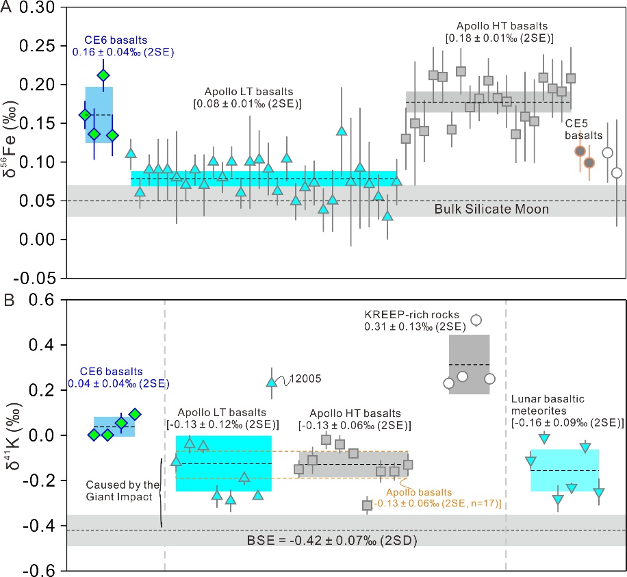 分析结果显示,所研究的玄武岩样品属于约 28 亿年前形成的低钛玄武岩。其铁同位素组成(δ⁵⁶Fe 值介于 0.13 ± 0.03‰至 0.21 ± 0.02‰)较以往所有已知的月球低钛玄武岩(包括阿波罗计划、嫦娥五号样品及月球陨石)平均偏重约 0.08‰。更为显著的是,其钾同位素组成(δ⁴¹K 值介于 0.001 ± 0.028‰至 0.093 ± 0.014‰)比已报道的所有阿波罗玄武岩样品平均偏重约 0.16‰。