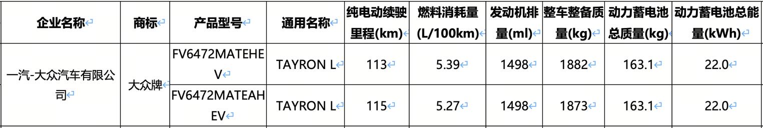 1 月 11 日消息,工信部公布了一汽 - 大众探岳 L PHEV 的申报图和相关信息,新车定位插混中型 SUV,搭载 1.5T 发动机 + 电动机组成的插电混动系统。