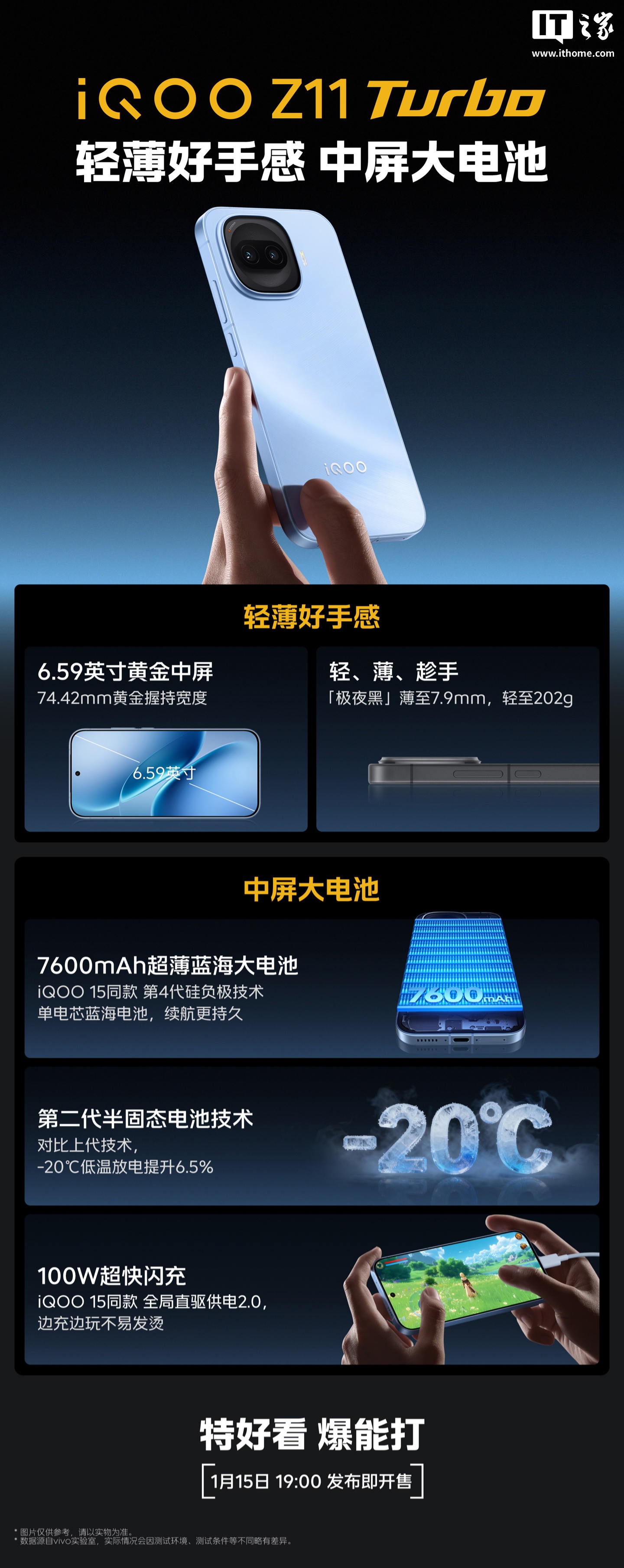 iQOO Z11 Turbo 现已定档 1 月 15 日发布,配备 6.59 英寸黄金中屏,拥有 74.42mm 黄金握持宽度、10.4mm 优雅舒适大 R 角,搭载第五代骁龙 8 芯片,拥有 iQOO 15 同款 Monster 超核引擎。