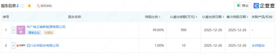 据企查查股权穿透显示,该公司由中广核集团旗下中广核云南新能源有限公司、通威股份旗下四川永祥股份有限公司共同持股。