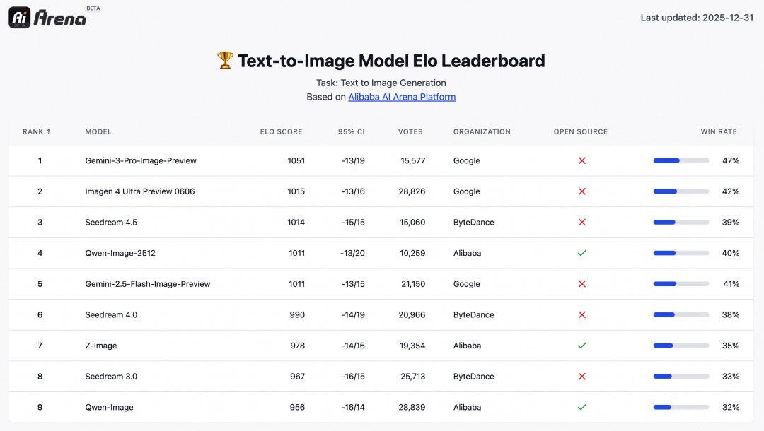 不止于能力增强,模型整体表现也实现突破:在 AI Arena 超过 1 万局的用户盲测中,数据显示 Qwen-Image-2512 在开源模型中表现最优,并在与多款闭源模型的对比中依然展现出显著竞争力。