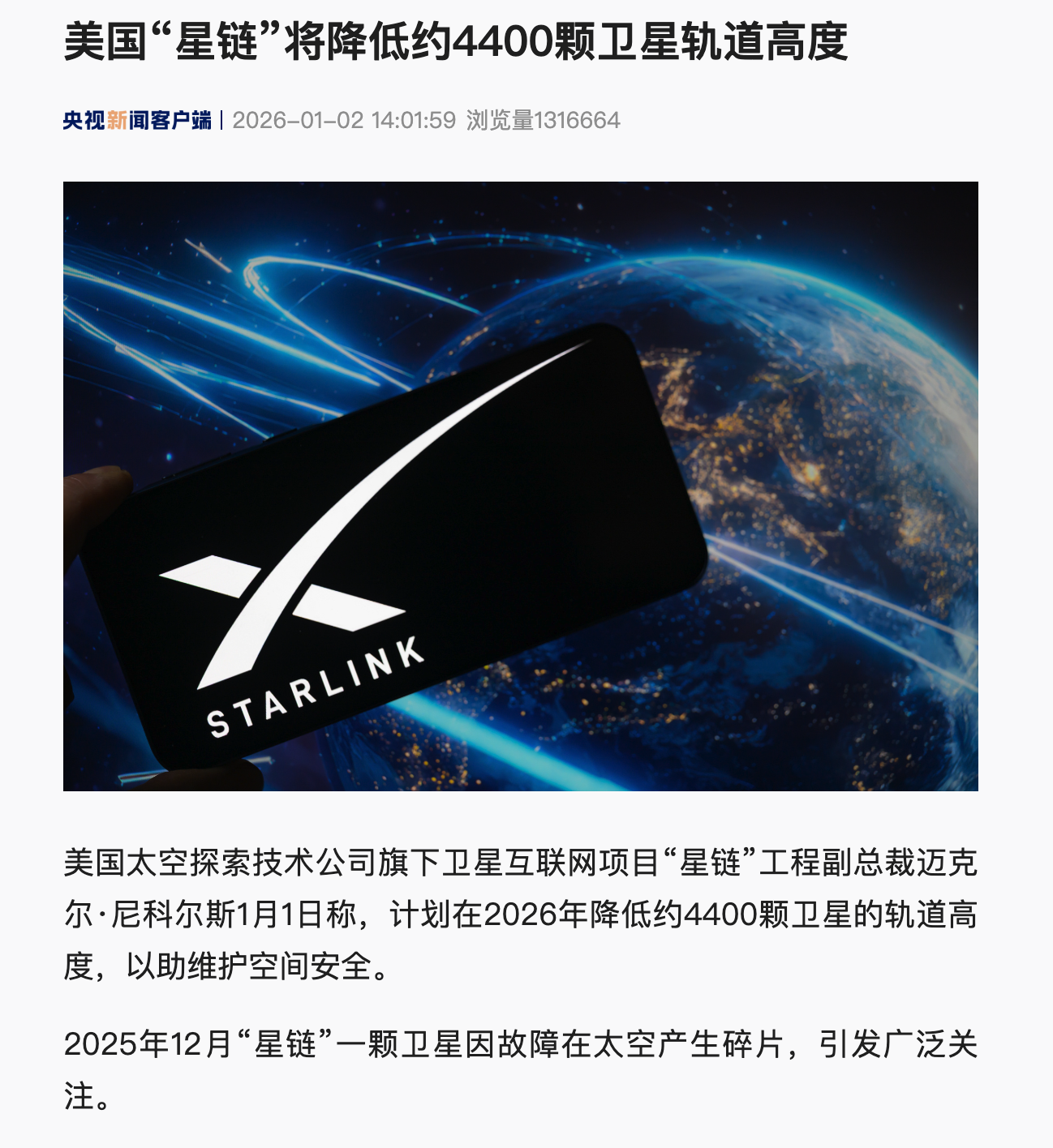 1 月 2 日消息,今天下午,据央视新闻报道,美国太空探索技术公司旗下卫星互联网项目“星链”工程副总裁迈克尔・尼科尔斯 1 月 1 日称,计划在 2026 年降低约 4400 颗卫星的轨道高度,以助维护空间安全。
