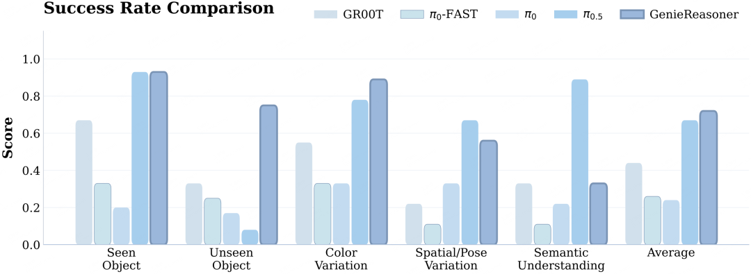 实验表明,GenieReasoner 不仅在推理能力上达到 SOTA,更在跨本体真机实验中展现了 SOTA 级别的泛化性。进一步的对比实验证实:VLA 模型更强的具身推理能力可显著提升其端到端动作执行表现,从而验证了 ERIQ 的评估价值。