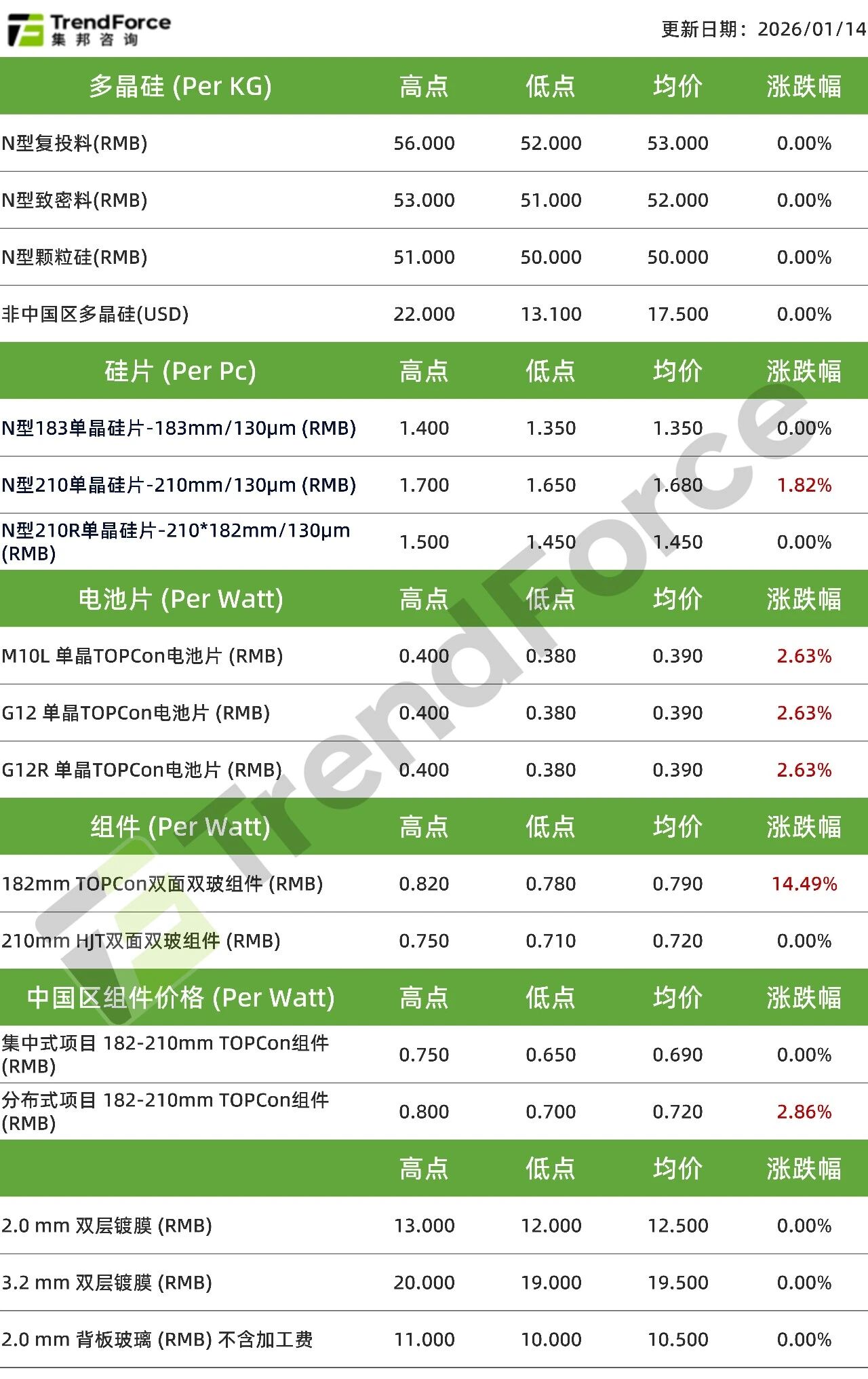 1月15日,集邦光储观察发布光伏产业链价格最新周评。