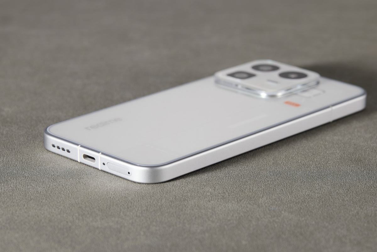 后壳下方视觉又变得克制与简洁,表面只有一个契合整体色调的 realme 字母 Logo,更多细节则隐藏在盖板下方,一道道自上而下的横纹格栅,搭配细致多样的朋克风金属装饰,还有 Make it real 个性铭牌,上手处处是惊喜。
