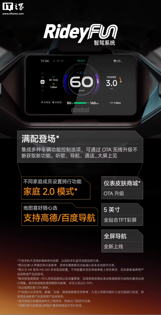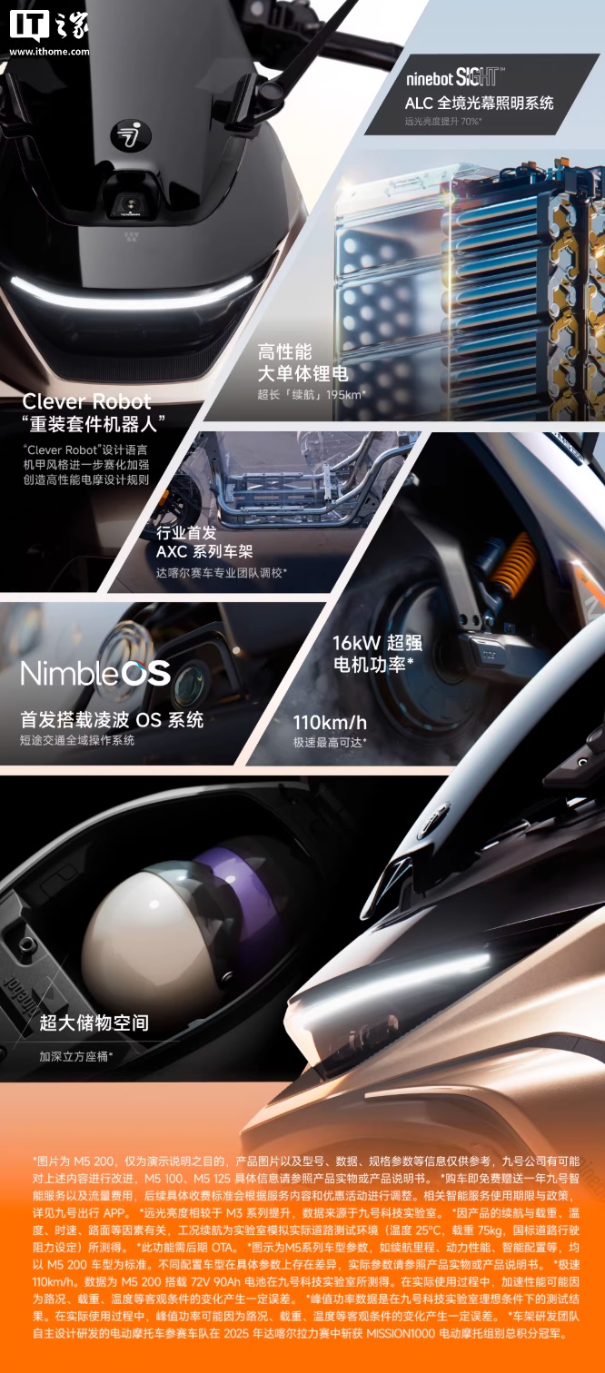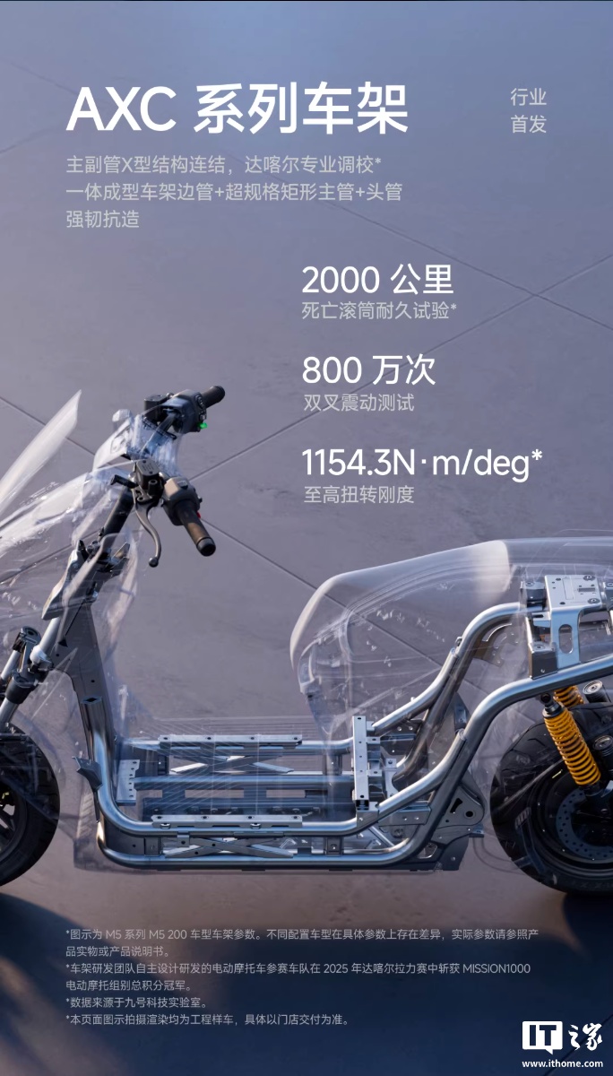 1 月 16 日消息,九号 M5 200 电动摩托车现已发布,新品主打旗舰设计,行业首发 AXC 系列车架,电机峰值功率可达 16kW,最高速度可达 110km/h,首发搭载 NimbleOS 系统,售价 19299 元起。