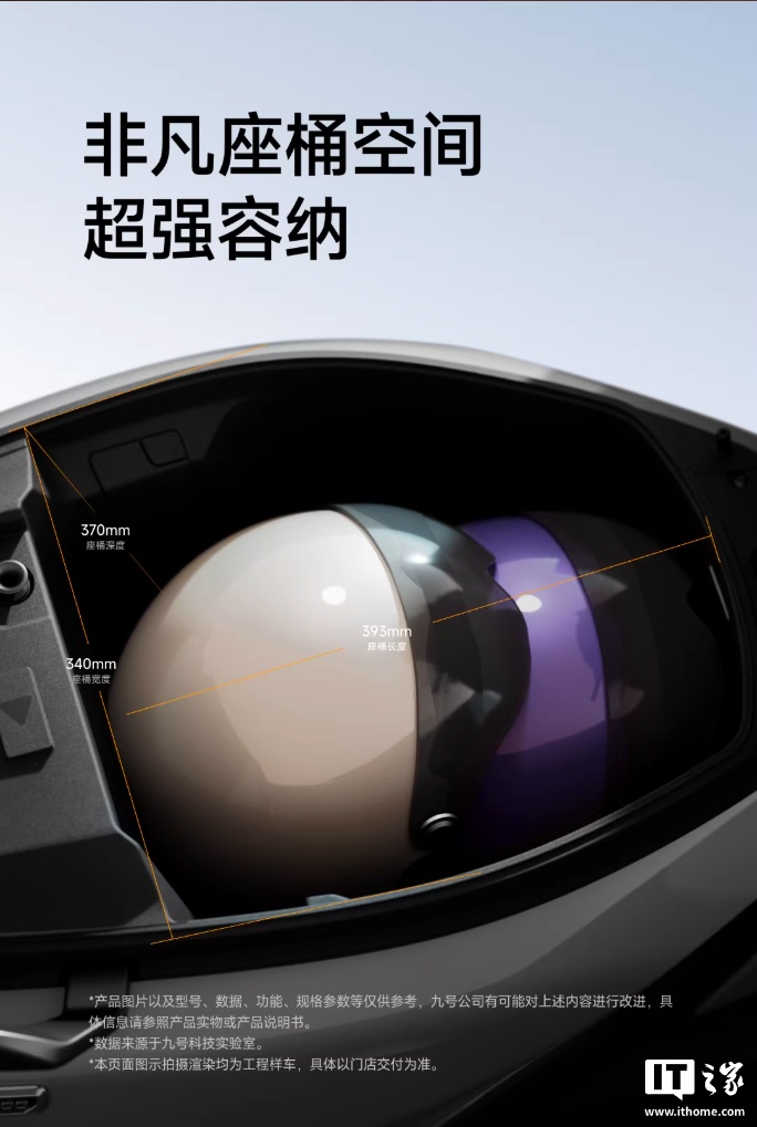 设计方面,这款产品拥有非凡坐桶空间,深度可达 370mm,长度 393mm,配备铝合金环式挂钩,静态承重可达 140kg,前面板拥有超大双物盒,容纳更多物品,行业首发 AXC 系列车架,主副管采用 X 型结构连接,通过 2000 公里死亡滚筒耐久试验。
