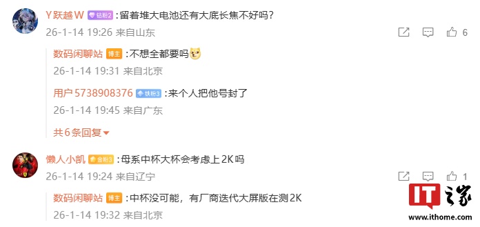 有网友询问母系中杯大杯会考虑上 2K 吗?博主表示:“中杯没可能,有厂商迭代大屏版在测 2K。”