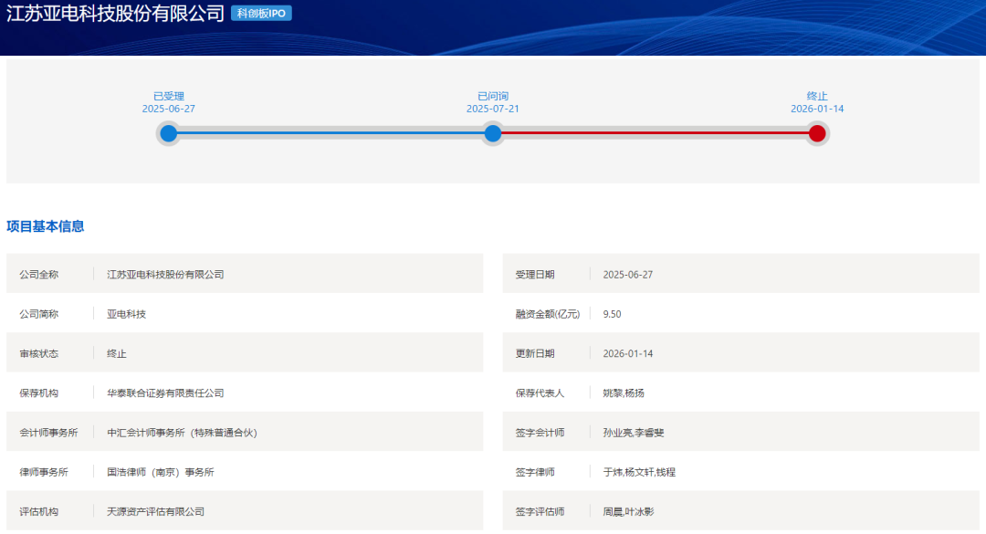 2026年1月14日,上交所官网显示,因江苏亚电科技股份有限公司及其保荐人撤回发行上市申请,上交所终止其科创板发行上市审核。