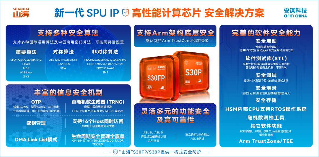 此外,“山海”S30FP/S30P 能够与 Arm 架构无缝融合,支持 Arm TrustZone、虚拟化等底层安全架构,和 Arm 的底层安全架构同源互补,形成系统协同,激活整个 Arm 安全体系的能力,从而建立完善的芯片安全体系。