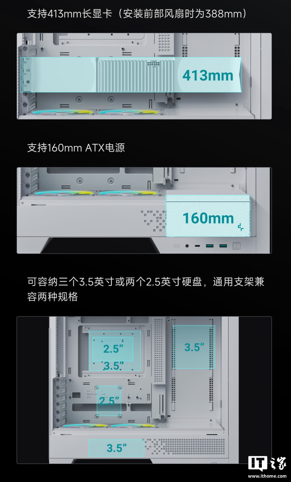 该机箱兼容标准 ATX / MATX 主板,显卡限长 413mm(安装前部风扇时为 388mm),支持 160mm ATX 电源,可安装 3 块 3.5 英寸或 2 块 2.5 英寸硬盘。