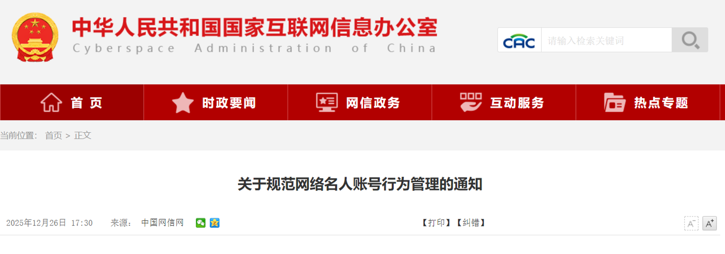 12 月 26 日消息,中央网信办秘书局今日发布关于规范网络名人账号行为管理的通知。