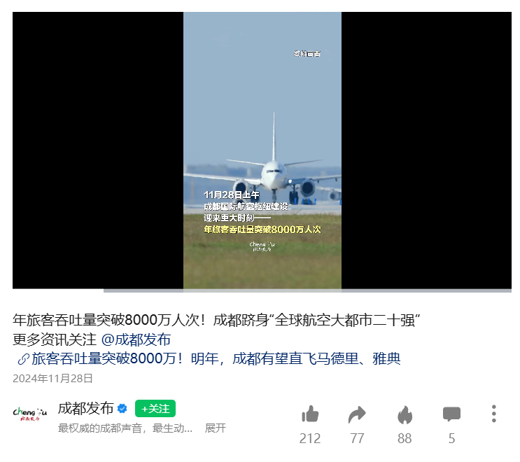 注意到,从城市整体旅客吞吐量来看,上海、北京、成都的年航空旅客此前已突破 8000 万人次,广州是第四个达成的城市。不过上海、北京、成都均有两座机场加持,广州仅凭一座机场就突破了 8000 万人次。