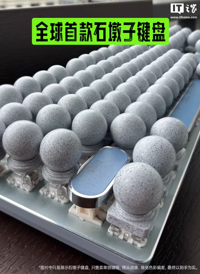 以“石墩子”键帽为例,该产品采用环氧树脂分层滴胶工艺,整体模仿现实中大理石墩子造型风格,整体尺寸为 1.7cm x 2.35cm,提供圆形底座和方形底座两种版本。