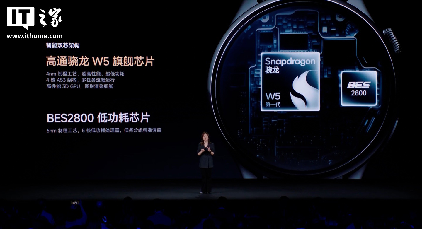官方强调该这是一款“全智能旗舰手表”,该机采用双芯双系统架构,搭载骁龙 W5 穿戴处理器(注:4nm 工艺 4 核 A53)+ BES2800 低功耗芯片,可独立运行支付宝 / 地图等多款 App,性能模式提供至高 6 天续航、省电模式至高 18 天。