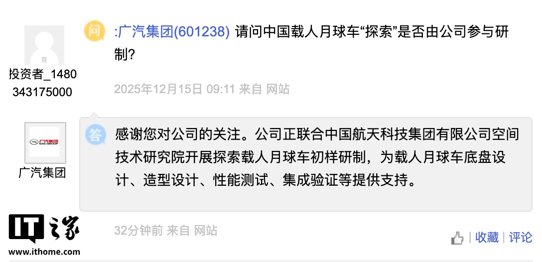 12 月 26 日消息,今天晚间,广汽集团在互动平台披露,公司正联合中国航天科技集团有限公司空间技术研究院(又称“中国空间技术研究院”“航天五院”)开展探索载人月球车初样研制,为载人月球车底盘设计、造型设计、性能测试、集成验证等提供支持。