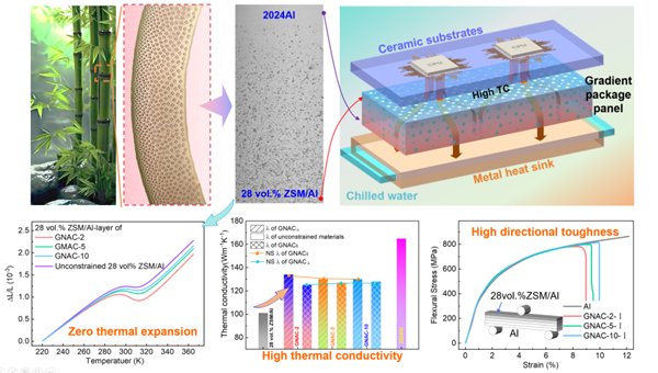 在此基础上,团队借鉴竹茎壁维管束梯度分布的生物力学原理,成功构筑出负膨胀 ZSM 颗粒含量呈梯度变化的铝基复合材料。
