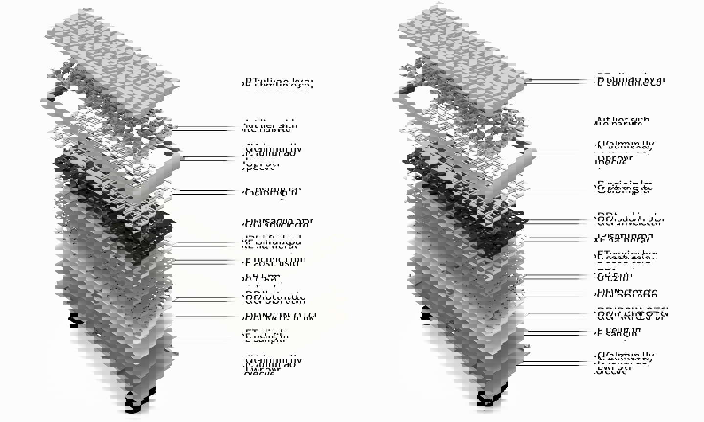 这款键盘采用 Gasket 垫片固定设计,在有限的高度空间中安排了 PC 定位板、1.2mm PCB 和六层声音包,支持全键热插拔(注:兼容凯华巧克力 V1 / V2 矮轴),配备 RGB 背光。