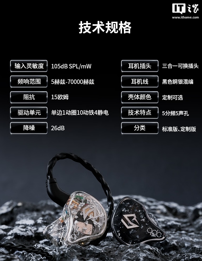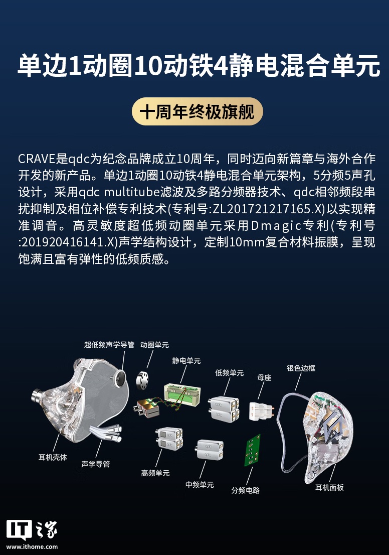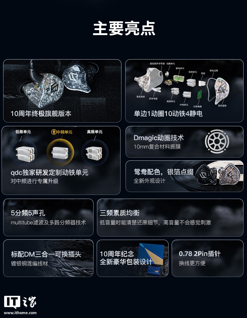 据介绍,这款耳机是 QDC 10 周年纪念产品,单边拥有 1 个动圈、10 个动铁、4 个静电单元,带有 5 分频、5 声孔设计,采用 QDC multitube 滤波及多路分频器技术以实现精准调音,可呈现富有弹性的低频质感。