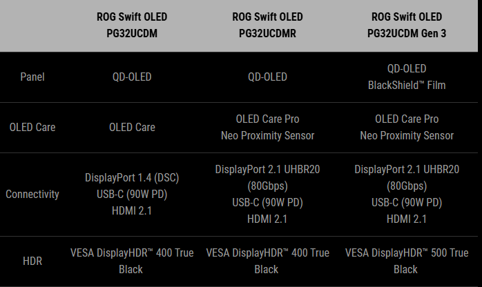 全新的 PG32UCDM Gen 3 采用 32 英寸的三星 QD-OLED 显示面板,延续了 4K 分辨率、240Hz 刷新率和 0.03ms(最小 GTG)响应时间,主打高端游戏与内容创作市场。