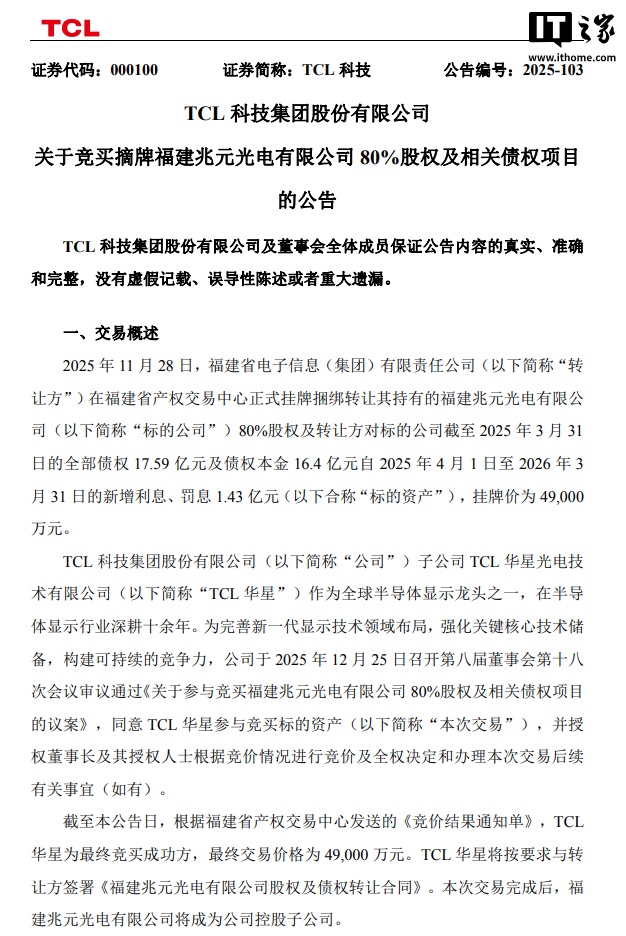 12 月 27 日消息,TCL 科技昨晚发布公告,旗下 TCL 华星光电技术有限公司以 4.9 亿元成功竞买福建省电子信息(集团)有限责任公司持有的福建兆元光电有限公司 80% 股权及相关债权,正式涉足 LED 芯片领域。