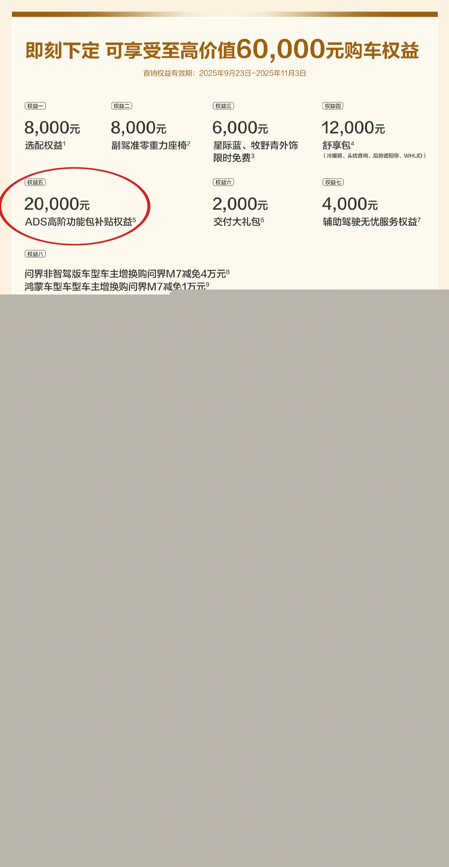 注:华为官方此次发布的优惠政策可理解为是对 ADS 功能包“出厂”价格的优惠,而目前搭载华为乾崑智驾的车型基本都已推出相关权益补贴优惠。以问界为例,用户购车时可享受 2 万元 ADS 高阶功能包补贴,折算后,用户实际购买 ADS 功能包约需 12000 元(补贴有 30 天时间限制)。