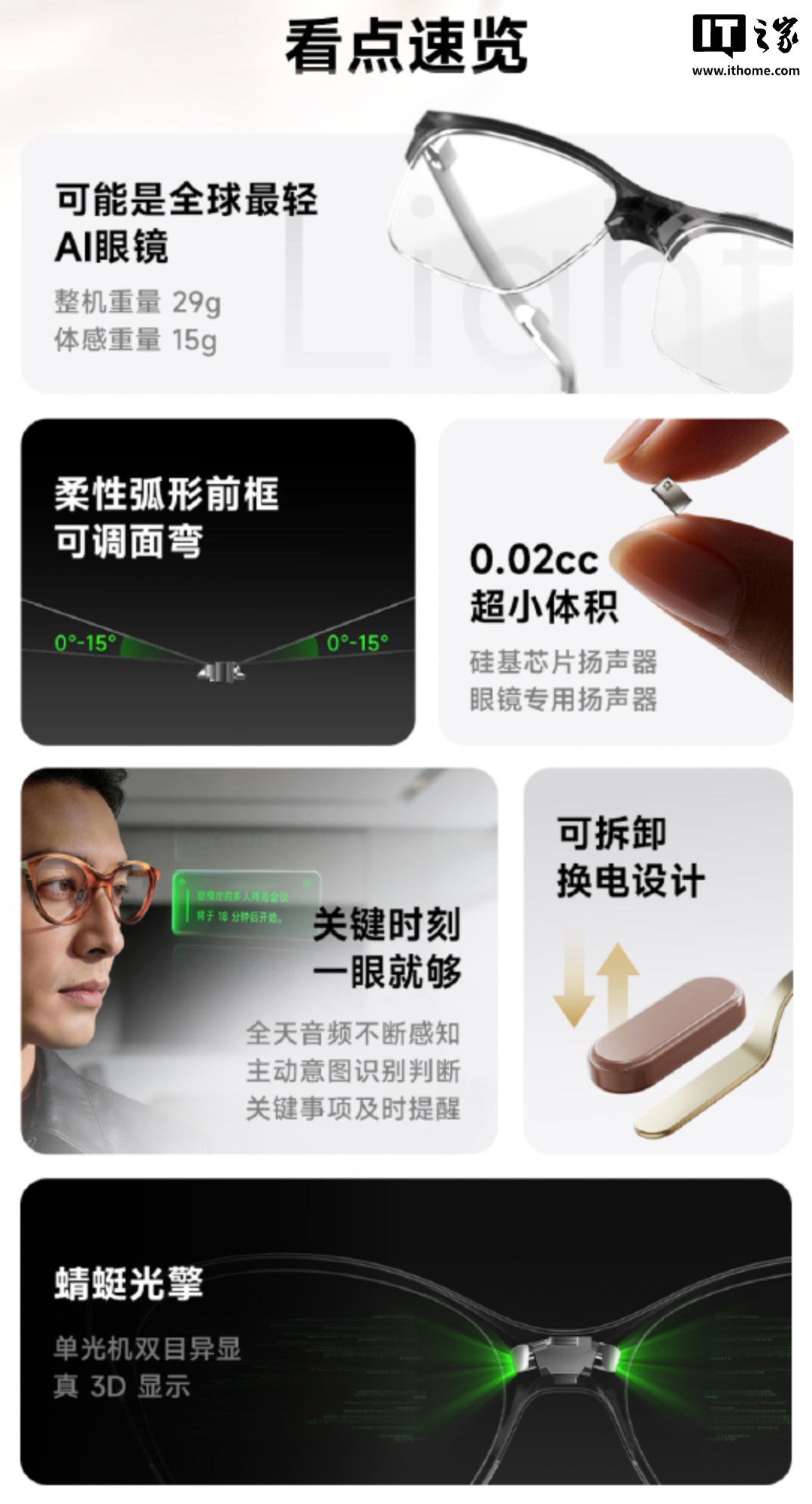 官方称该产品“可能是全球最轻的 AI 眼镜”,整体重量 29g,主打“单光机双目异显”以实现 3D 效果,同时产品内置 0.02cc 超小体积扬声器,镜腿采用可拆卸换电设计。